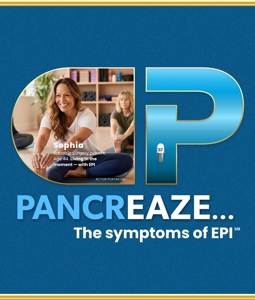 References: 1. PANCREAZE Full Prescribing Information. Campbell, CA: VIVUS LLC; 2024. 2. Cystic Fibrosis Foundation. (n.d.). Phthalates. Retrieved March 3, 2022, from https://www.cff.org/phthalates 3. Cleveland Clinic. (n.d.). Exocrine Pancreatic Insufficiency (EPI). Retrieved from https://my.clevelandclinic.org/health/diseases/21577-exocrine-pancreatic-insufficiency-epi 4. Othman MO, et al. Introduction and practical approach to exocrine pancreatic insufficiency for the practicing clinician. Int J Clin Pract. 2018;72:e13066. 5. Cleveland Clinic. (n.d.). Pancreas. Retrieved from https://my.clevelandclinic.org/health/body/21743-pancreas 6. Struyvenberg MR, et al. Practical guide to exocrine pancreatic insufficiency - breaking the myths. BMC Med. 2017;15(1):29. 7. The National Pancreas Foundation (n.d.). About Chronic Pancreatitis. Retrieved from https://pancreasfoundation.org/patient-information/chronic-pancreatitis/ 8. Fousekis FS, Theopistos VI, Katsanos KH, Christodoulou DK. Pancreatic Involvement in Inflammatory Bowel Disease: A Review. J Clin Med Res. 2018;10(10):743-751. 9. Dominguez-Muñoz JE, et al. European PEI Multidisciplinary Group. European guidelines for the diagnosis and treatment of pancreatic exocrine insufficiency: UEG, EPC, EDS, ESPEN, ESPGHAN, ESDO, and ESPCG evidence-based recommendations. United European Gastroenterol J. 2025 Feb;13(1):125-172. 10. Mayo Clinic. (n.d.). Gastric bypass (Roux-en-Y). Retrieved from https://www.mayoclinic.org/tests-procedures/gastric-bypass-surgery/about/pac-20385189 11. Uribarri-Gonzalez L, et al. Exocrine pancreatic function and dynamic of digestion after restrictive and malabsorptive bariatric surgery: a prospective, cross-sectional, and comparative study. Surg Obes Relat Dis. 2021 Oct;17(10):1766-1772 12. Vujasinovic M, et al. Pancreatic Exocrine Insufficiency after Bariatric Surgery. Nutrients. 2017 Nov 13;9(11):1241.